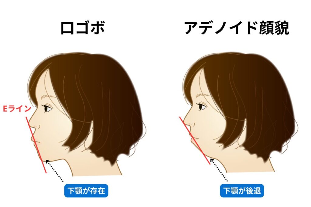 「アデノイド顔貌」は口元がEラインから突出している点で「口ゴボ」と似ています。