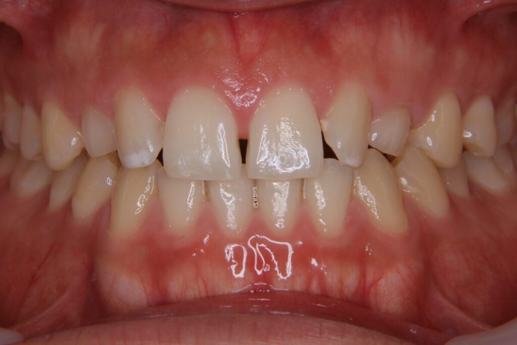 上下のすき間と上の前歯の突出感を気にされてご相談いただきました。診断では右上の犬歯の先天欠損により空隙が生じ、咬合バランスにも影響を与えていました。