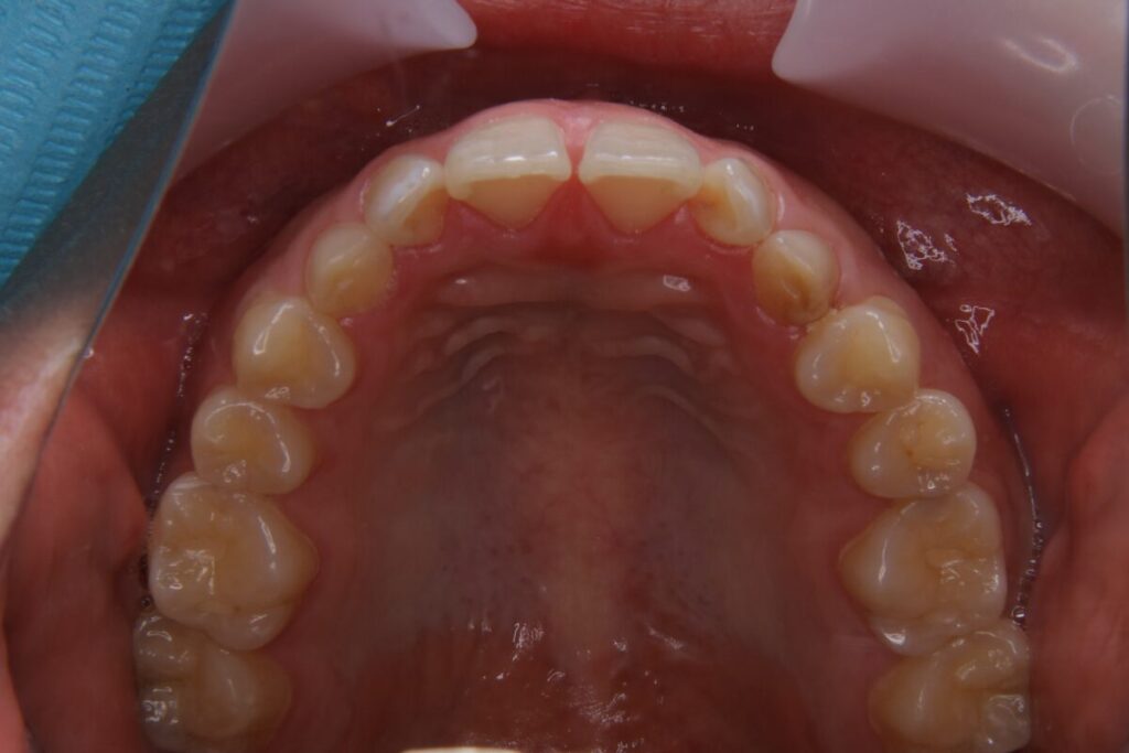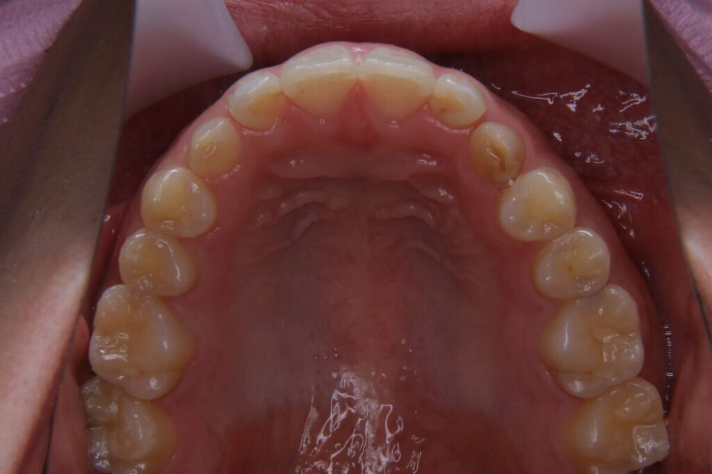 診断では、上顎犬歯の先天欠損が原因で空隙歯列が形成されており、自然な咬合への誘導が必要なケースでした。