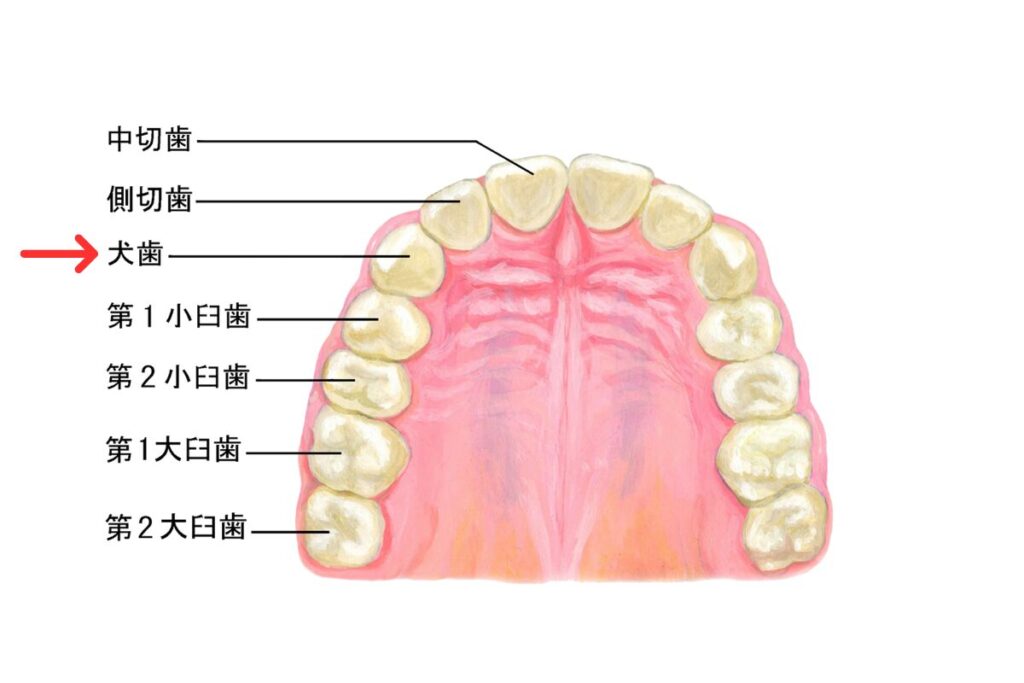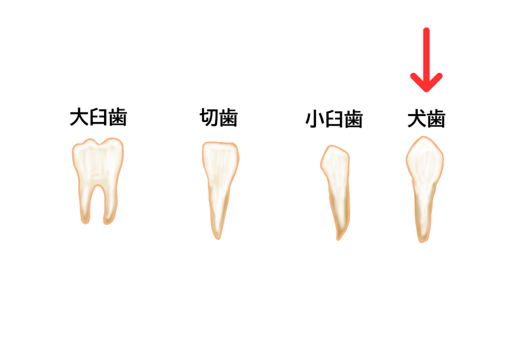 犬歯は前歯から奥歯へと曲がる、歯列の最もカーブしている位置にあります。