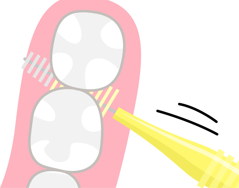 歯と歯の間にゆっくりと斜めに差し込み、前後に2〜3回やさしく動かして汚れをかき出します。ブラシが曲がったり毛が開いたりしたら交換のサインです。